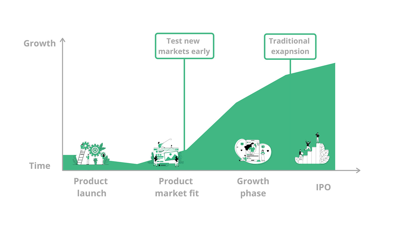 Traditional expansion - launch your product, reach product-market-fit, scale the business in your home market, and only then start expanding.