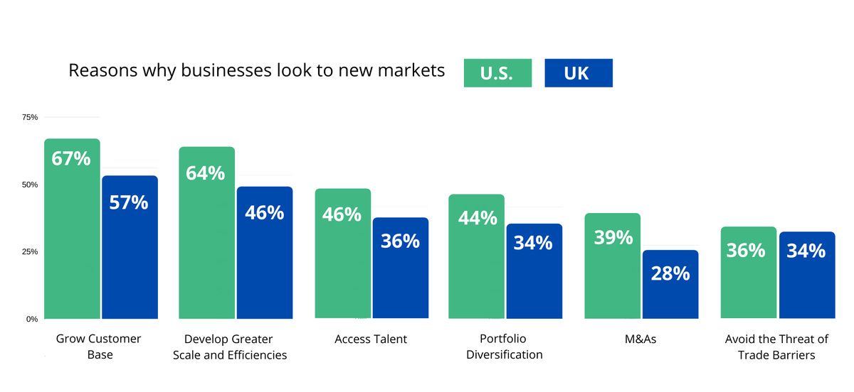 According to a study by Velocity Group titled the “2020 State of Global Expansion,” the main reasons for companies to expand internationally are to grow customer base, develop a greater scale, and efficiencies and access talent. The study surveyed 500 startups across the US and UK to discover why and how they expand to new markets.