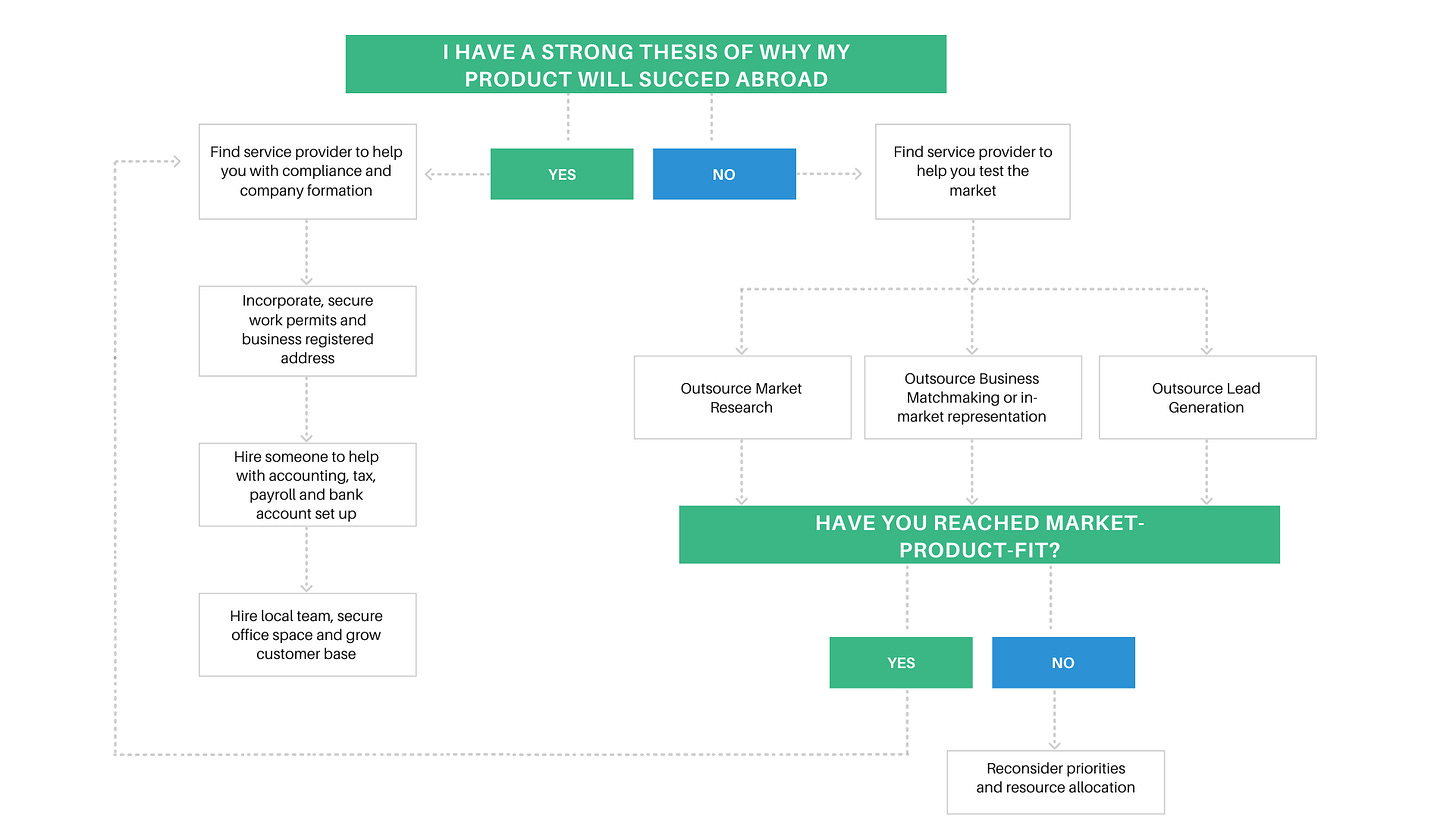 Validation first, company establishment second - hire a service provider to help you test the market through services like market research, business matchmaking, in-market representation, and lead generation.